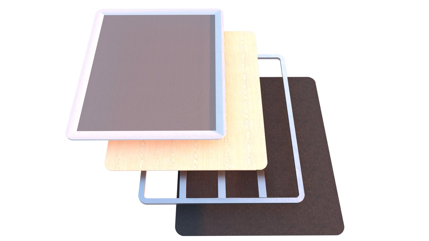Tapa del canapé en madera con refuerzo en acero inoxidable de primera calidad y tapizada con tejido transpirable 100% de material 3D (tejido con multitud de hilos entrelazados con efecto rejilla para permitir el paso del aire y garantizar la transpiración del colchón) de color a juego con el cuerpo del canapé.